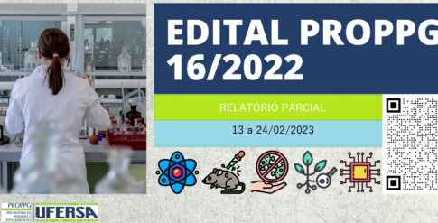 Prezada comunidade acadêmica. Comunicamos que o período de envio de Relatório parcial do Edital PROPPG 16/2022 (PIBIC) será de 13 a 24 de fevereiro do...