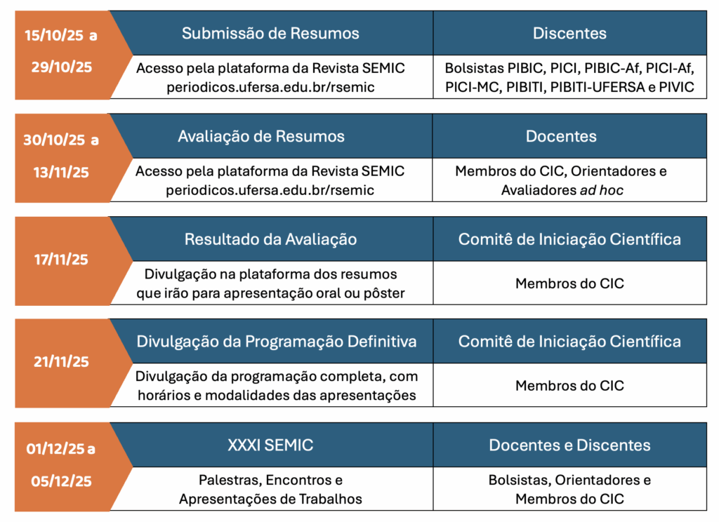 É com grande satisfação que anunciamos a programação do XXXI Seminário de Iniciação Científica – XXXI SEMIC, da Universidade Federal Rural do Semi-Árido – UFERSA. O evento acontecerá no período de 1 a 5 de dezembro de 2025, integrando a Semana Universitária da UFERSA, e envolverá as atividades de pesquisa científica, tecnológica e de inovação relacionadas aos planos de trabalho de iniciação científica desenvolvidos no interstício 2024–2025. Durante este período, novos conhecimentos foram produzidos e agora serão apresentados à comunidade ufersiana.